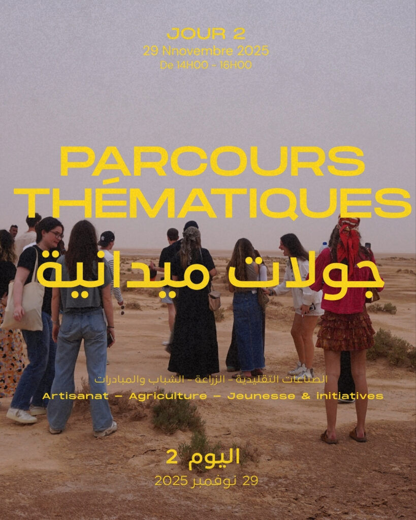 The public day of the event extends this exploration by highlighting local practices through exhibitions, open stands, and thematic pathways in Nefta. One pathway focuses on traditional crafts and their contemporary reinvention. Workshops such as the El Mensej weaving space illustrate how heritage skills are being reinterpreted by women and young creators, turning craftwork into a source of economic independence, cultural affirmation, and environmental sustainability through the use of natural materials and durable production processes. Another pathway addresses sustainable oasis agriculture, showcasing farmers, agricultural development groups, and associations engaged in diversification, circular economy practices, agrotourism, and the valorisation of local products. These practices demonstrate how ecological transition can emerge from grassroots cooperation between producers, citizens, and territorial organisations. A third pathway sheds light on youth initiatives and the role of shared spaces, such as youth centres, local associations, and educational hubs, in enabling young people to gather, create, and develop civic, artistic, and social projects. These spaces reveal both the aspirations and the constraints faced by youth and encourage reflection on how to design more inclusive territorial dynamics.