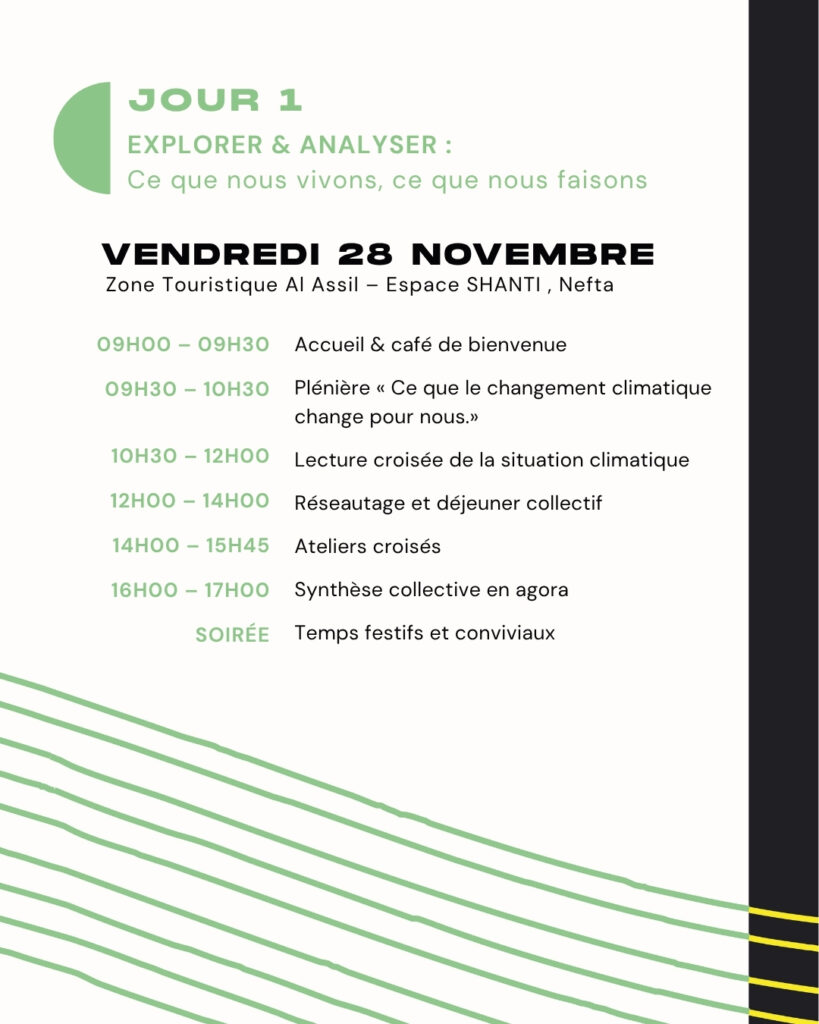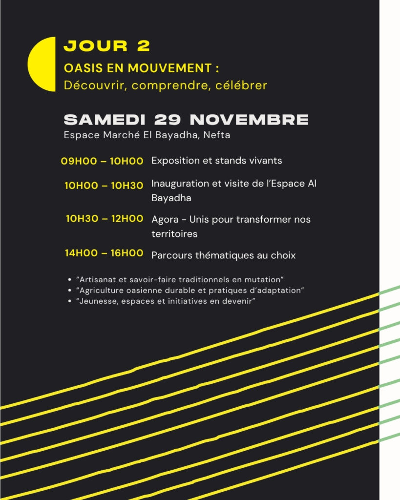 The choice of Nefta, an oasis in southwestern Tunisia that is simultaneously vulnerable to climatic pressures and rich in collective initiatives, anchors the event in a specific territorial reality. Oasis ecosystems face acute challenges such as water scarcity, salinisation, and shifting economic models. At the same time, Nefta hosts a dynamic network of associations, agricultural groups, cooperatives, cultural spaces, and youth led initiatives. These actors illustrate how local forms of cooperation can inform broader strategies for resilience and ecological transition.