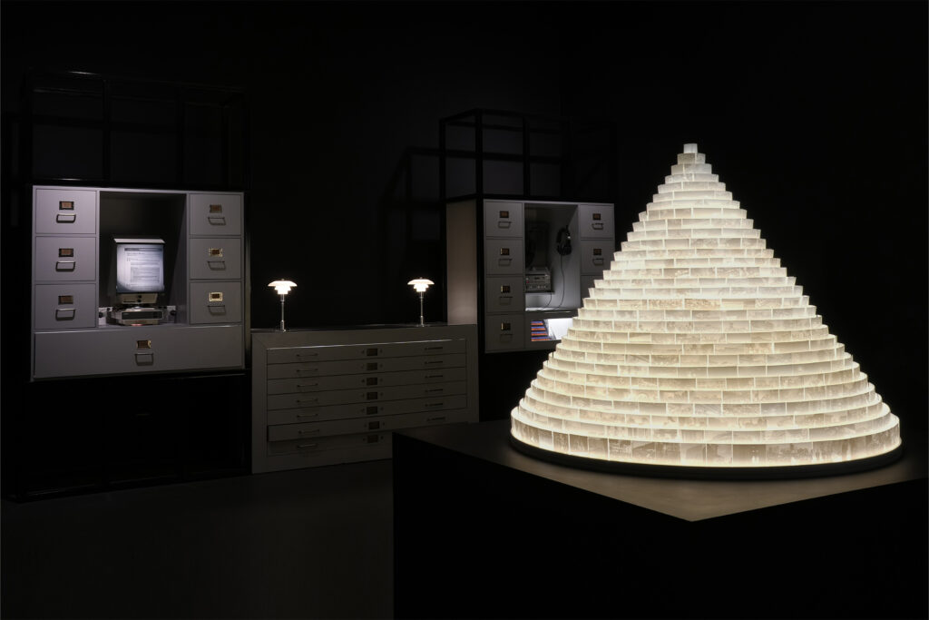 In the videos section, the first focal element is a three dimensional printed concentric pyramid composed of twenty nine circular layers, each corresponding to a day of the uprising, with diameters that increase to reflect the growth of documentation. The piece is motivated by the semantics of the word revolution as both systemic change and cyclical movement, and it formalizes this tension by placing a linear chronology into a circular geometry. The installation translates the archive into tangible form through a process that mirrors archaeological low relief techniques: each video thumbnail is converted into a height map that generates an embossed plane. This conversion is methodologically consequential because it treats the image not only as representation but as relief structure, aligning compression artifacts with an archaeological imagination of stratification. The viewer encounters accumulation as volume, and volume as an interpretive demand. More documentation does not yield immediate clarity; it yields the obligation to sort, situate, and judge.