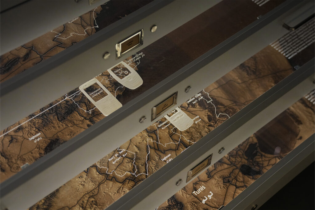 The second focal element in the videos section consists of regional maps that categorize videos by seven key areas, including Sidi Bouzid, Kasserine, and Tunis, with additional sites listed as Nabeul, Sfax, Bizerte, and Gabes. Here the installation makes a pointed claim about the politics of visibility. Variations in the quality and quantity of recordings reflect socioeconomic disparities because access to recording technology depends on financial capacity. By juxtaposing layered topographic cutouts with phone models assigned through an analysis of metadata, and by adding textual annotations about social class and propagation routes, the work constrains interpretation by embedding an account of how evidence becomes available in the first place. This constraint matters because post hoc historiography can misread evidentiary density as historical importance, when it may instead index infrastructural privilege.