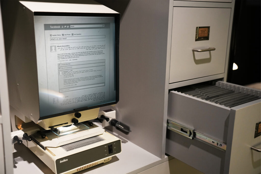 The posts section addresses a different dimension of archival instability: interface as a condition of intelligibility. Facebook status updates that facilitated decentralized protest organization are preserved on microfilm, and the viewer manually scrolls through the reel using a reader. This choice produces a temporal distortion that is conceptually central. It forces attention to the bodily habit of scrolling and reveals that the platform feed is not only a neutral container but a pedagogy of perception. Manual microfilm reading makes legibility dependent on effort and orientation, reintroducing scarcity and duration into a domain typically defined by speed and excess. The posts are no longer encountered as endlessly replaceable items in a stream, but as traces that require time to be reassembled into meaning.
