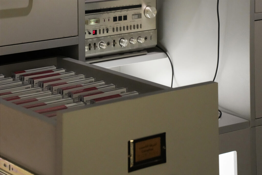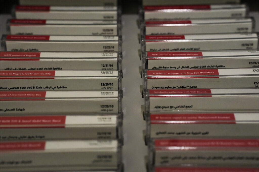 The sounds section extends these arguments into the sonic domain. It begins with a vinyl record that contains an amateur song documenting the burning of a police station in Menzel Bouzaiane, and it places this recording into a listening environment that treats sound as both document and participant in collective action. The adoption of vinyl is not a simple gesture toward durability. It reveals how archival value is performed through format, because vinyl implies deliberate listening and curated preservation in a way that compressed audio shared online often does not. Adjacent to the vinyl are cassette tapes that preserve protest slogans and anthems, organized by duration, region, and date, forming a layered sonic archive that acknowledges ephemerality while insisting on the historical weight of chant, rhythm, and repetition. Deterioration and noise become part of the record, not as romantic patina but as an inscription of the material vulnerability of memory.