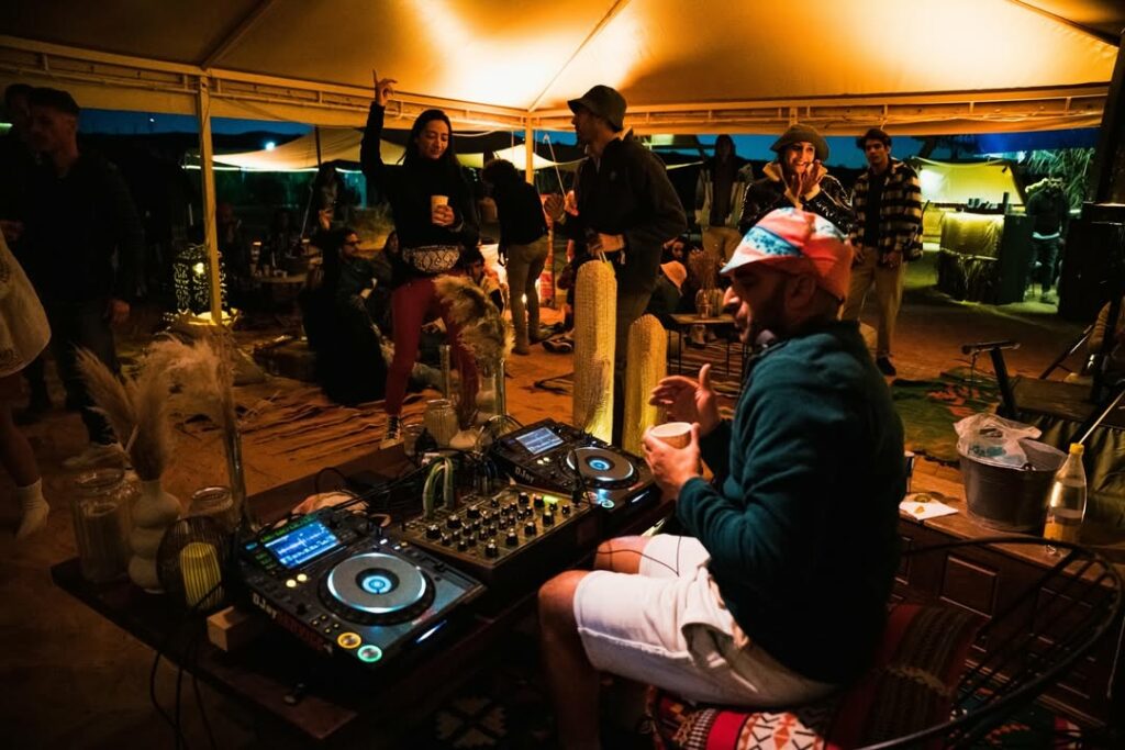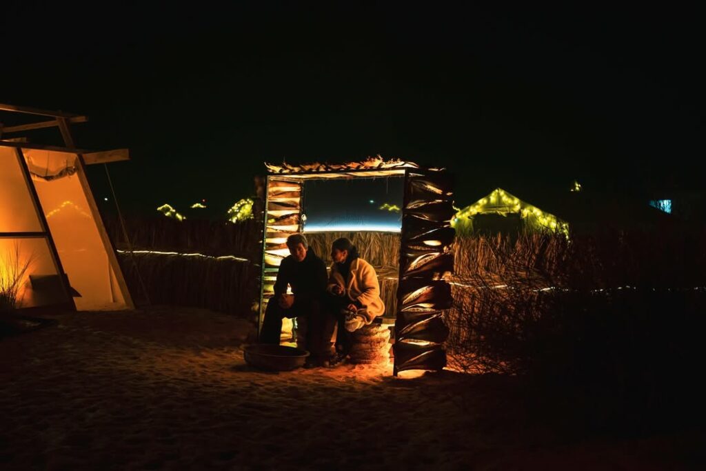 The program integrates cultural production wellness practices and forms of exploration in a manner that avoids strict separation between domains. Musical performances visual mapping cinema projections and performative arts are presented in open settings where distinctions between performers and participants remain fluid. Rather than functioning as spectacles these practices are embedded within the collective life of the camp and often interact directly with the surrounding landscape. Visual elements such as projections and light based interventions engage the material qualities of sand darkness and open space creating transient spatial configurations.
