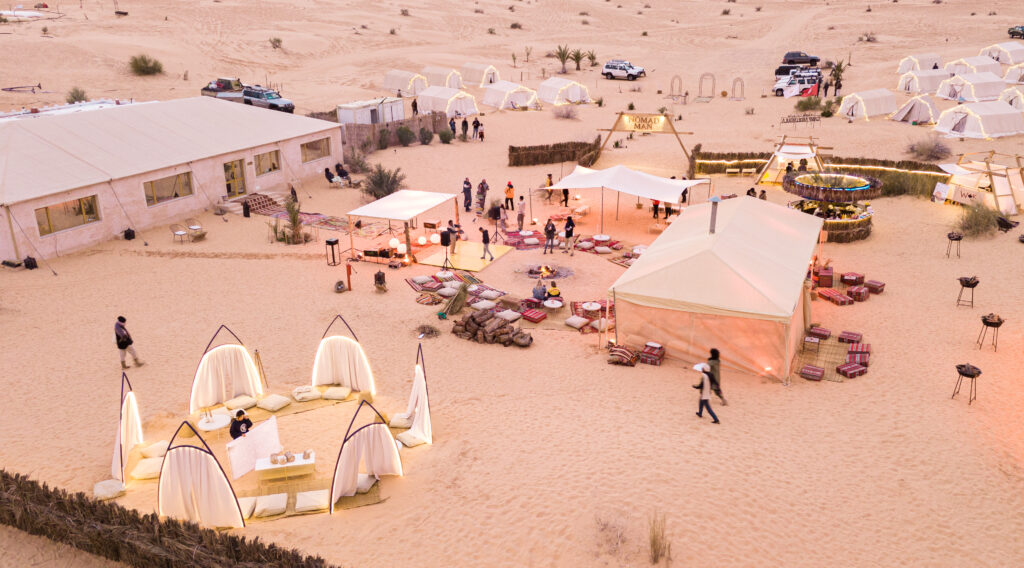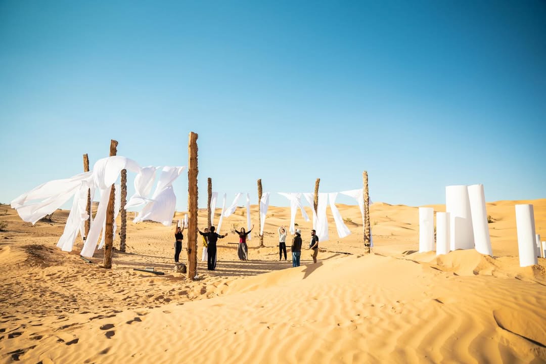 The location of Nomad Man plays a central role in shaping the experience. The site known as Tiniri Camp is located deep within the Grand Erg Oriental and is accessible only through coordinated travel involving long distance road transport followed by guided four wheel drive navigation across sand dunes. This process of access establishes a gradual transition from urban space to desert territory and contributes to a heightened awareness of distance and disconnection. The absence of mobile network coverage at the site further reinforces this separation and reorients social interaction toward direct presence and shared situational awareness. In this context space is not treated as a neutral setting but as an active agent that structures movement perception and social relations.